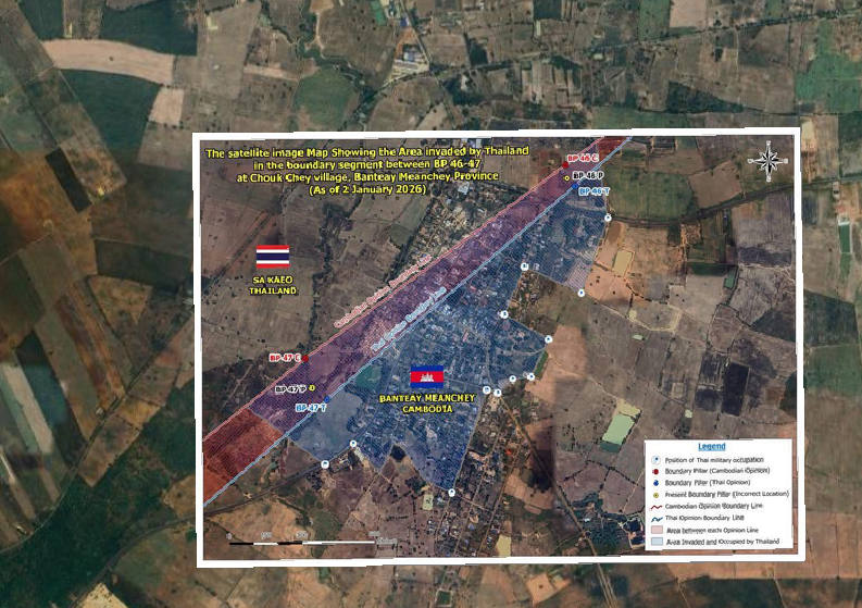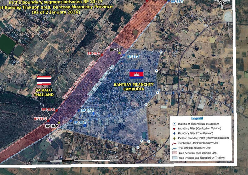 A map produced by Cambodia's Ministry of Foreign Affairs showing Cambodian's claimed border (red), Thailand's claimed border (blue), and Thailand's alleged area of control as of 2 January 2026.