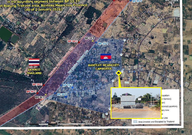 The Boeung Trarkuon is a large settlement in Banteay Meanchey province. Most of the village is recognised by both countries as Cambodian territory, with a small portion of the village claimed by both countries. Video footage taken by journalists following the 27 December ceasefire indicates that Thailand has placed barbed wire and shipping containers demarcating areas of control within undisputed Cambodian territory, more than 900 meters east of the Thai-claimed border.